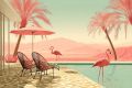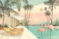 Sunlit Serenity: Retro Palm Springs Poolside with Flamingos and Neon Palms