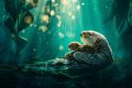 Sunlit Embrace: A Mother Sea Otter and Her Pup Amidst Kelp