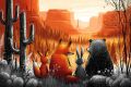 Surreal Amber Desert: Cacti Silhouettes Against a Swirling Dusk