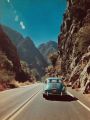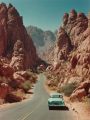 Vintage Car Cruising Through Sunlit Canyons on a Winding Road