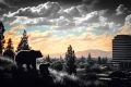 "Sunset Silhouettes: Bear Family Against San Jose's Skyline"