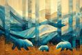 Autumn Whispers in Cubist Woods: Mother Bear and Cubs Amidst Geometry