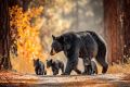 Autumn Wanderers: A Mother Bear Guides Her Cubs Through Fallen Leaves