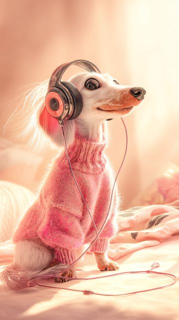 Bathed in a soft, golden hue, the petite dachshund basks under a stream of sunlight, a scene of serene joy captured within the intimate space of a bright, cozy bedroom. Wearing a fluffy pink sweater that complements its sleek, shiny coat, this charming creature embodies warmth and whimsy. Its large headphones, resting gently over its perky ears, seem to transport it to a world of rhythmic beats and melodious harmonies. As it gazes upward, perhaps following the gentle dance of nearby peach blossoms in a soft breeze, one can almost hear the faint strains of a lullaby playing through the speakers. The ambiance is one of pure enchantment, with elements of a fairy tale woven into the fabric of the everyday. The detailed, Pixar-style visualization adds a sense of magical realism, making the ordinary extraordinary and inviting viewers to pause and smile at the gentle beauty of the moment.