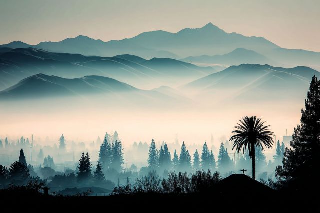 As the sun lifts its golden head above the horizon, its rays spill over San Jose, crowning the city in a soft, breath-stealing radiance. The view presents a layered spectacle of nature’s finesse juxtaposed with human ingenuity, seen through the delicate dance of light and shadow across the undulating mountain ridges in the distance, casting gradients from a luminous silver to deepest blue. Below, the fog weaves a ghostly layer, enshrouding the lower cityscape in a misty embrace, lending the scene an element of mystique and tranquility. Amidst this ethereal landscape stands a solitary palm, striking in its simplicity and poise against the complexity of the muted city and rolling hills. It serves as a natural marker, a sentinel witnessing the daily transformation brought by the rising sun. This moment captured in time speaks to the heart of the waking city, revealing its quieter, softer side beneath the bustling urban spirit. Subtleties in the shades reveal the city awaking: distant structures peek through the mist, and trees dot the scenery with varying heights and densities, suggesting life persisting in serene defiance of urban sprawl.